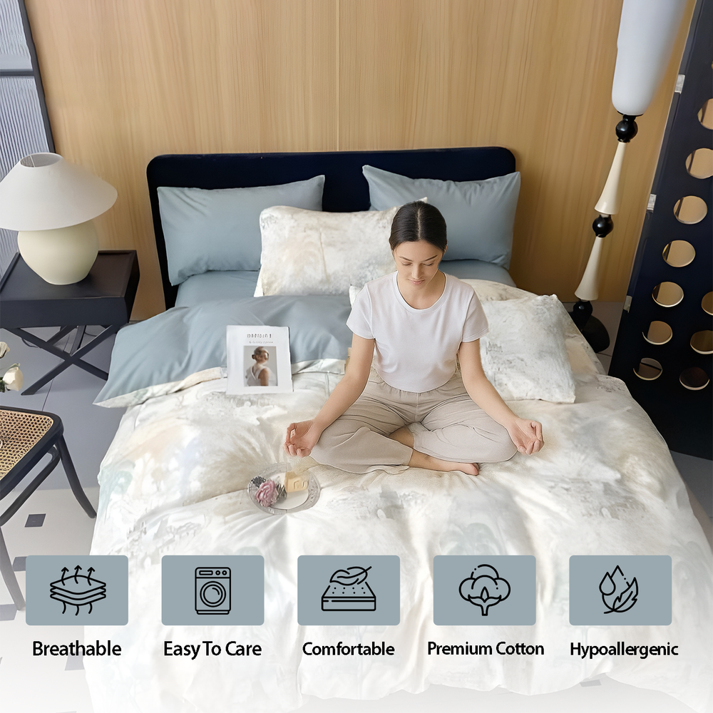 تحتوي كل مجموعة على ملاءة واحدة ملائمة، وغطاء لحاف واحد (لا يشمل اللحاف)، و4 أكياس وسادة بحجم 50 × 80 سم للحصول على مظهر منسق كامل.