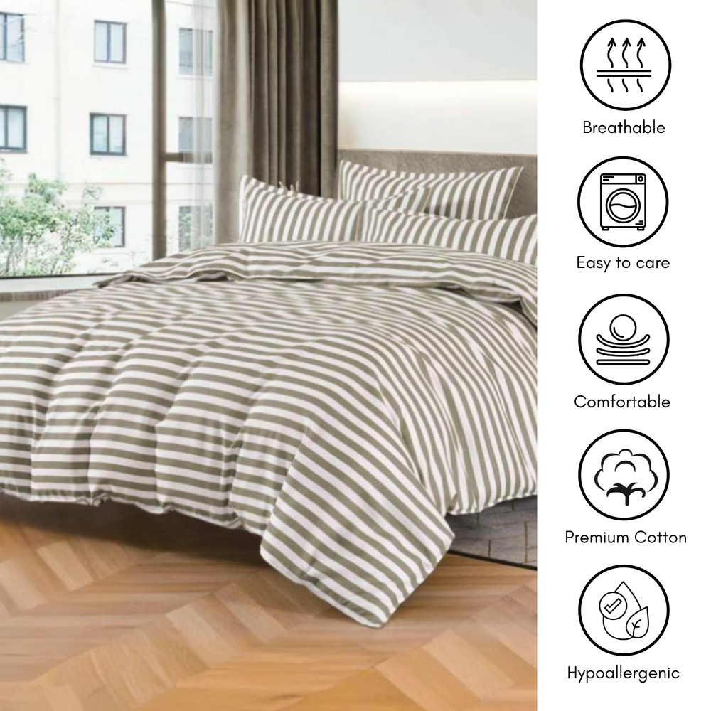 يتضمن طقم الفراش هذا ملاءة سرير مسطحة (250 × 270 سم)، وغطاء لحاف (220 × 240 سم)، وأربعة أغطية وسائد متطابقة (50 × 80 سم). ملاحظة: اللحاف غير متضمن.
