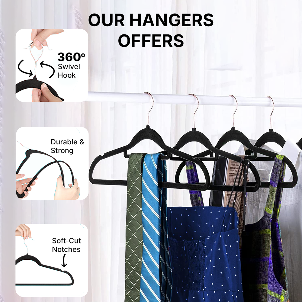 تتميز كل علاقة بخطاف دوار 360 درجة مقاوم للصدأ لتعليق مرن، بالإضافة إلى قضيب مركزي للأوشحة وربطات العنق والإكسسوارات. تصميمها الموفر للمساحة يجعلها مثالية لتنظيم خزانة ملابسك بكفاءة. مناسبة لملابس الرجال والنساء والأطفال. تتضمن العبوة علاقات مخملية فاخرة مانعة للانزلاق لاستخدام طويل الأمد.