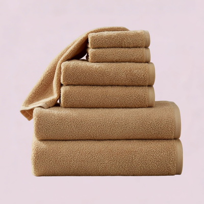 Soft tan towel laid flat highlighting plush terry surface