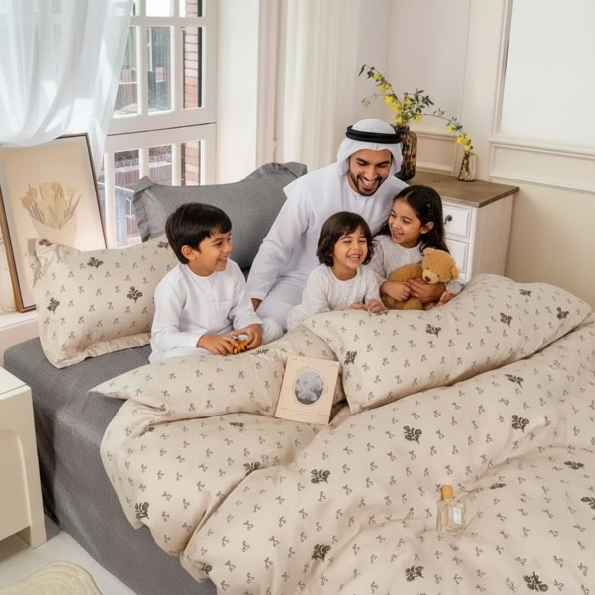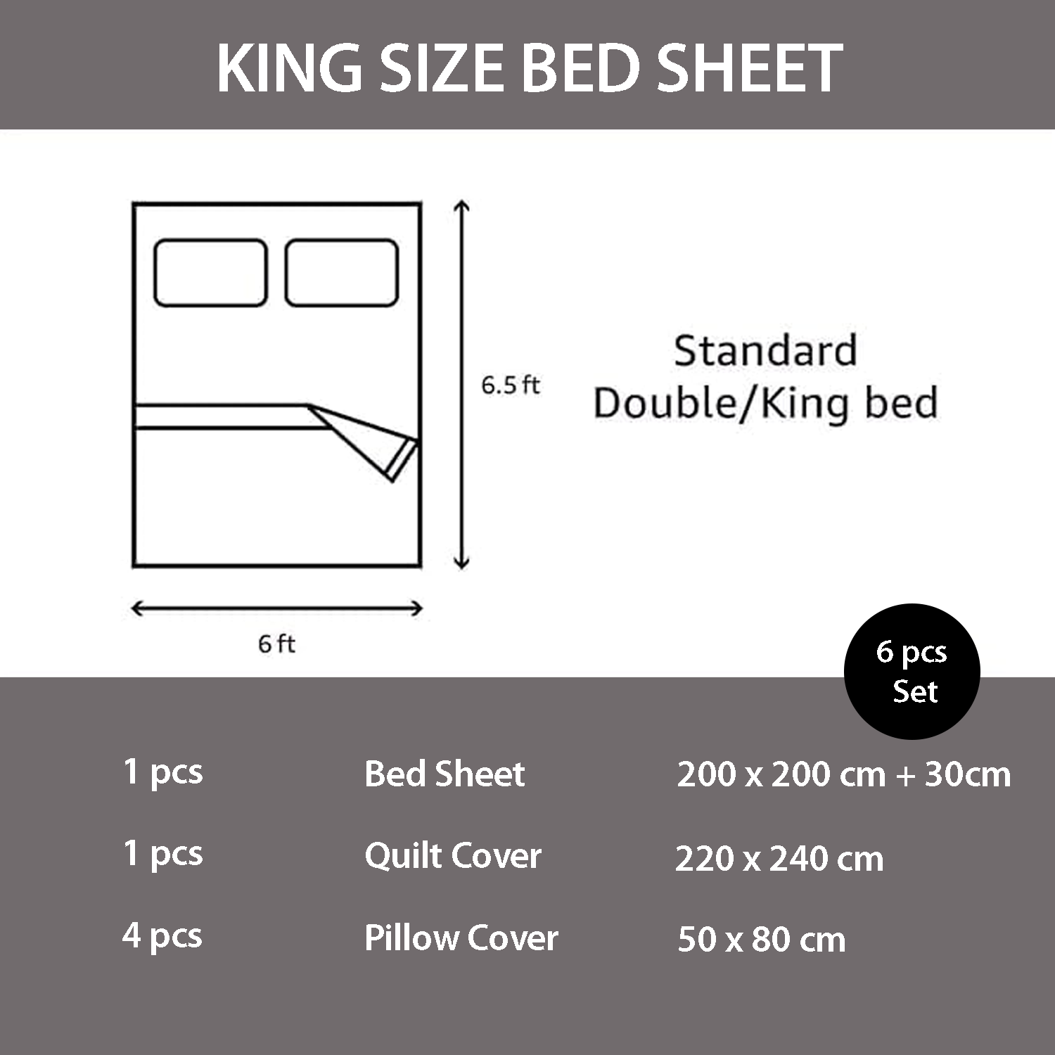 تحتوي كل مجموعة على ملاءة واحدة ملائمة، وغطاء لحاف واحد (لا يشمل اللحاف)، و4 أكياس وسادة بحجم 50 × 80 سم للحصول على مظهر منسق كامل.
