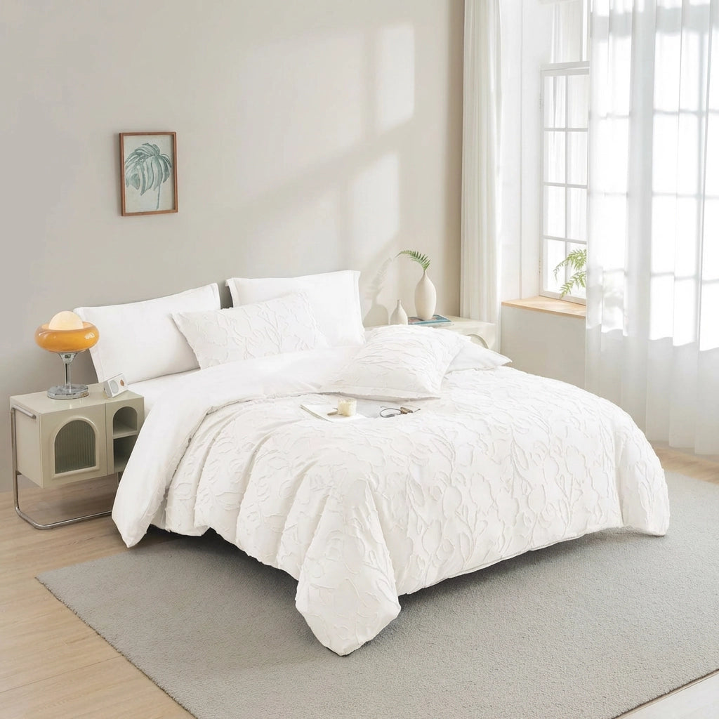 White duvet cover set paired with fitted sheet and coordinating pillowcases