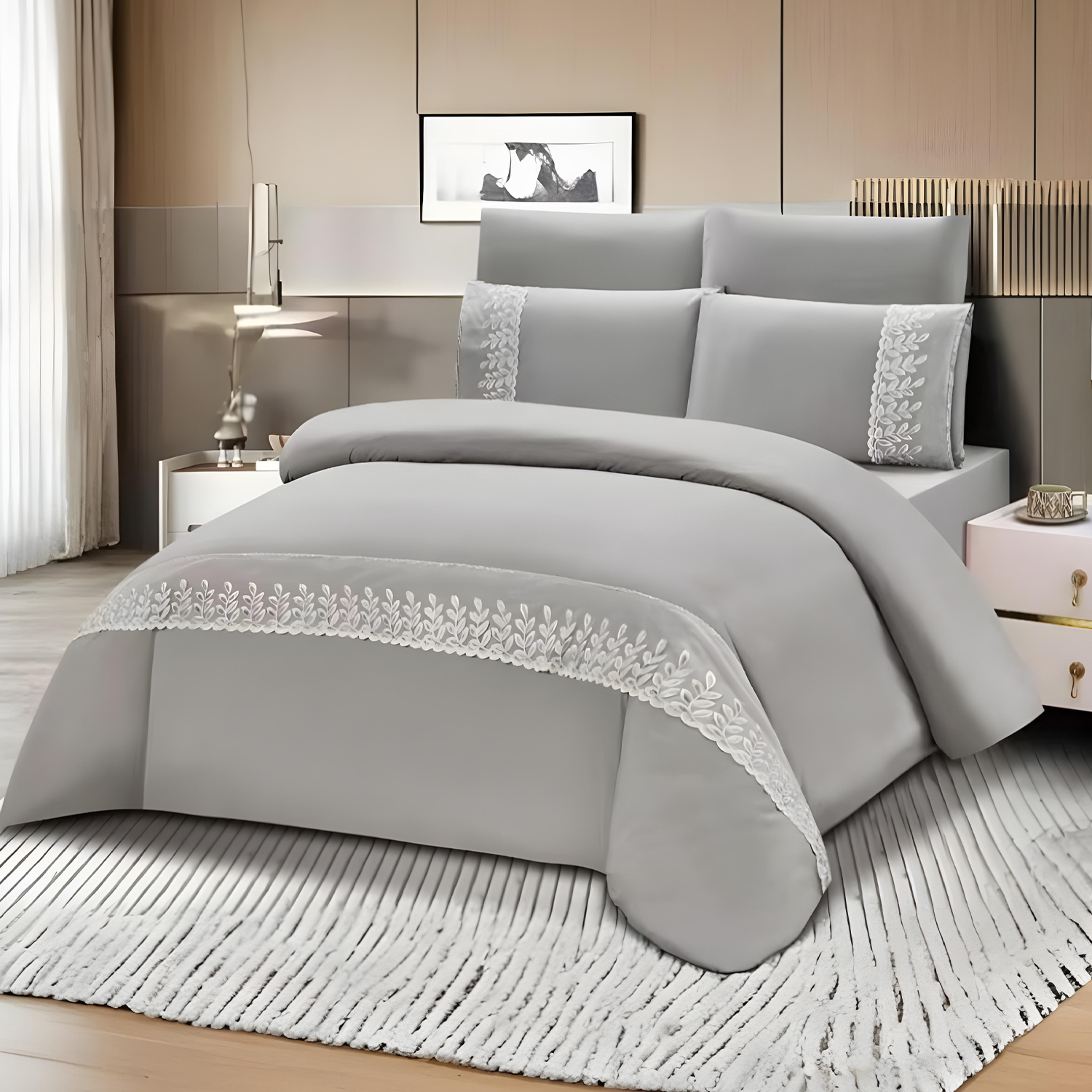 Luxury Border Design King Bed Bedding Set – 6 PCs with Sheet, Duvet & Pillowcases (Grey)