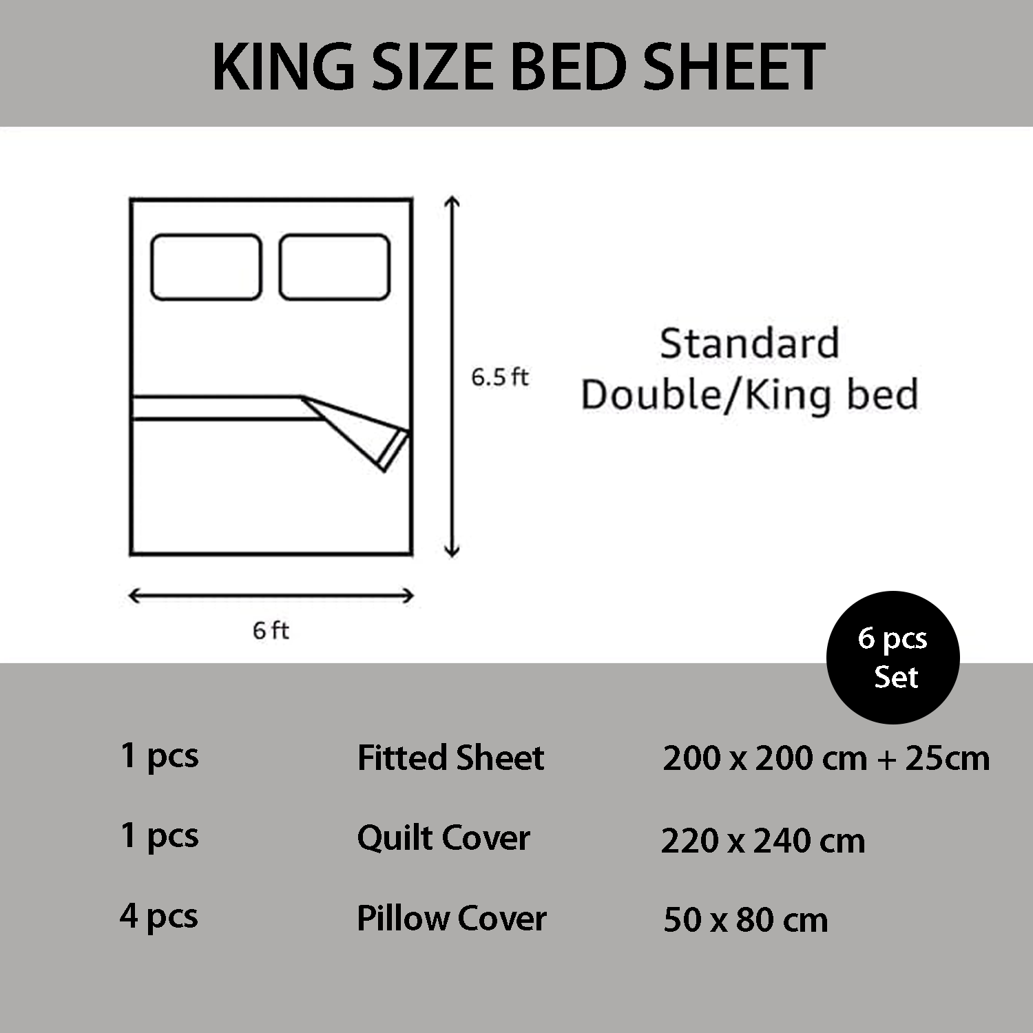 Size  1 Duvet cover 220x240cm, 1 Fitted Sheet with deep pockets 200x200cm + 25cm, and 4 pillowcases 50x80cm