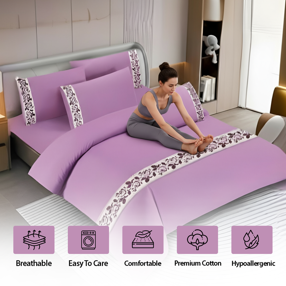Pattern Border Cotton King Size Bed Sheets 6 PCs - Fitted Sheet, Duvet & Pillowcases (Purple)