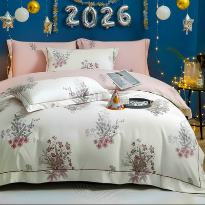 Floral patterned bedding set with grey, pink, and green tones styled on a bed