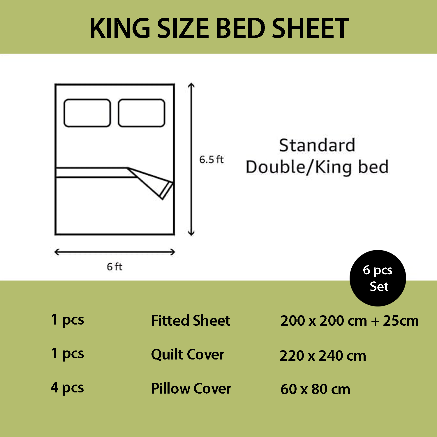 Size  1 Duvet cover 220x240cm, 1 Fitted Sheet with deep pockets 200x200cm + 25cm, and 4 pillowcases 60x80cm
