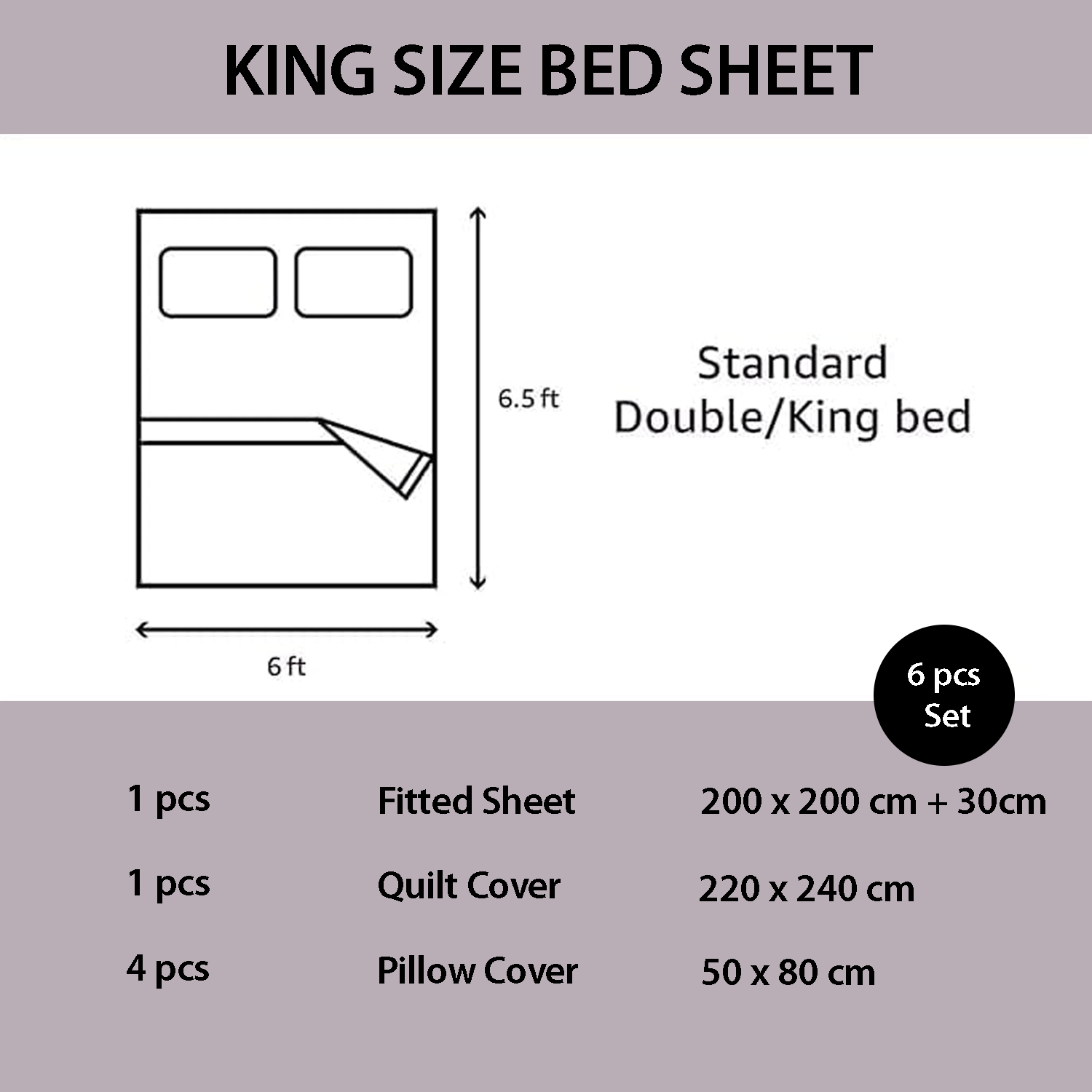 Size  1 Duvet cover 220x240cm, 1 Fitted Sheet with deep pockets 200x200cm + 30cm, and 4 pillowcases 50x80cm