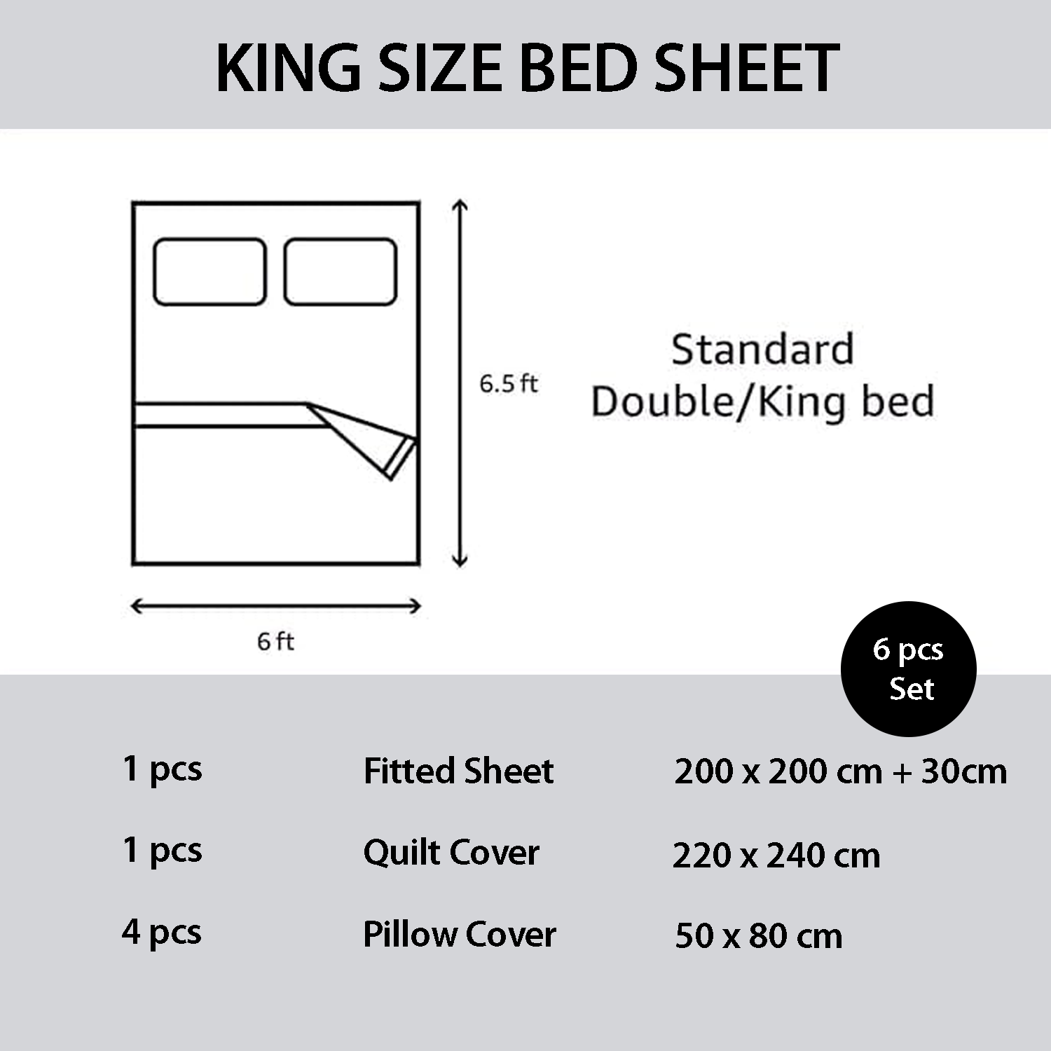 Size  1 Duvet cover 220x240cm, 1 Fitted Sheet with deep pockets 200x200cm + 30cm, and 4 pillowcases 50x75cm