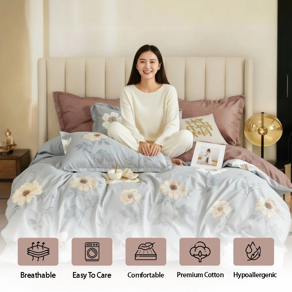 Bedroom setup showing flower print quilt cover, bed sheet, and pillow cover