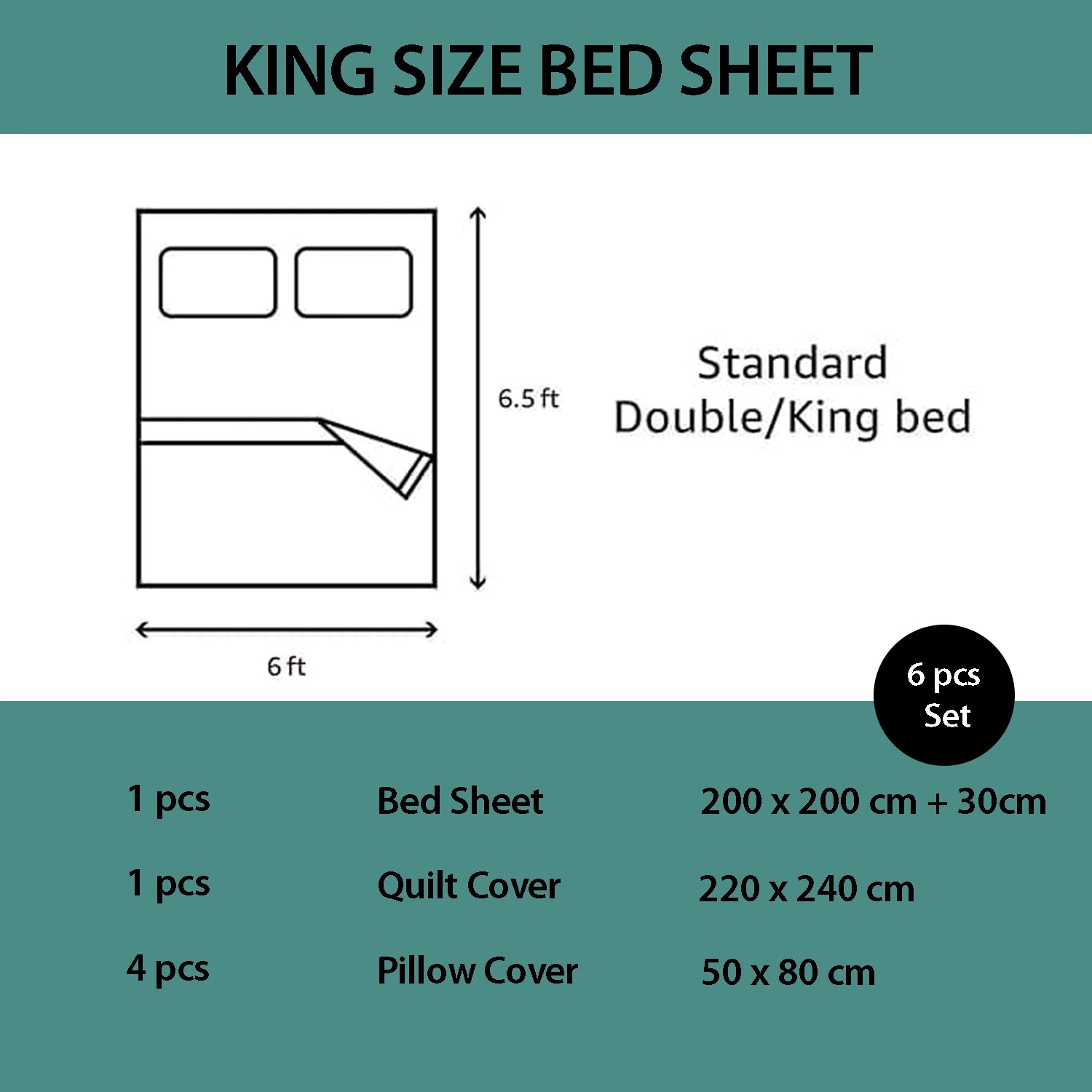 Experience luxury with our 6-piece King Size Bed Sheet Set, including a 220x240cm duvet cover, a 200x200cm fitted sheet with deep 30cm pockets, and four 50x80cm pillowcases. Designed for a perfect hotel-style fit, the fitted sheet features elasticized corners that stretch side to side, ensuring a snug, secure fit that stays in place—even with movement during sleep.
