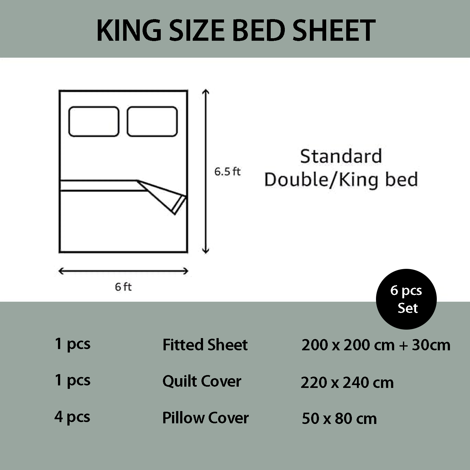 Experience luxury with our 6-piece King Size Bed Sheet Set, including a 220x240cm duvet cover, a 200x200cm fitted sheet with deep 30cm pockets, and four 50x80cm pillowcases. Designed for a perfect hotel-style fit, the fitted sheet features elasticized corners that stretch side to side, ensuring a snug, secure fit that stays in place—even with movement during sleep.