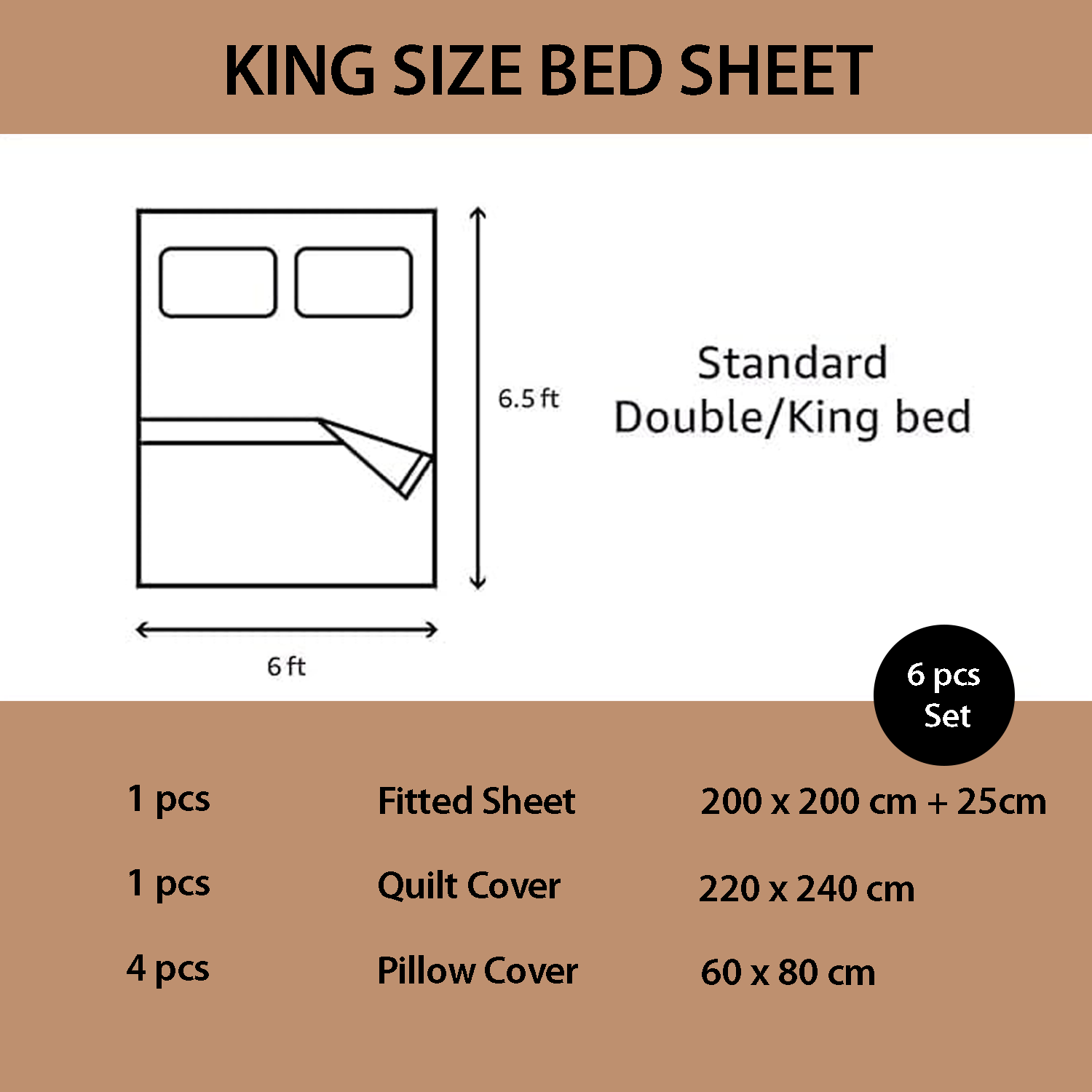 Size  1 Duvet cover 220x240cm, 1 Fitted Sheet with deep pockets 200x200cm + 25cm, and 4 pillowcases 60x80cm