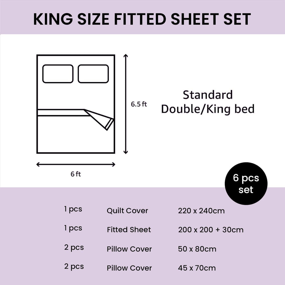 Indulge in luxurious comfort with the MOONCEE 6-piece King Size Bedding Set, expertly crafted from a premium cotton blend for a soft, breathable, and soothing sleep experience. Wake up refreshed each morning, surrounded by unmatched comfort. The complete set includes a 220x240 cm duvet cover, a 200x200 cm fitted sheet with a 30 cm depth, and four 50x75 cm pillow covers—ensuring your king-size bed is dressed in coordinated elegance and style.